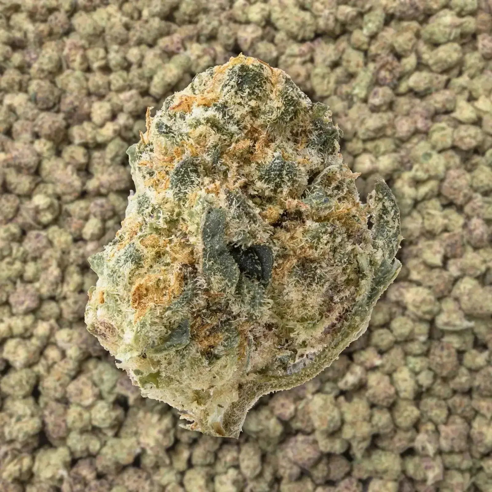 - Appearance: Dense, sticky, green/purple buds with orange hairs and thick, frosty trichomes